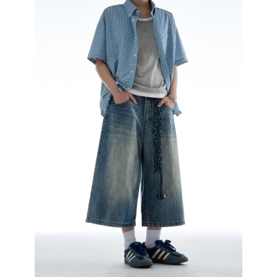 Retro washed bamboo striped seven quarter jeans with loose straight leg design for men and women, casual pants
